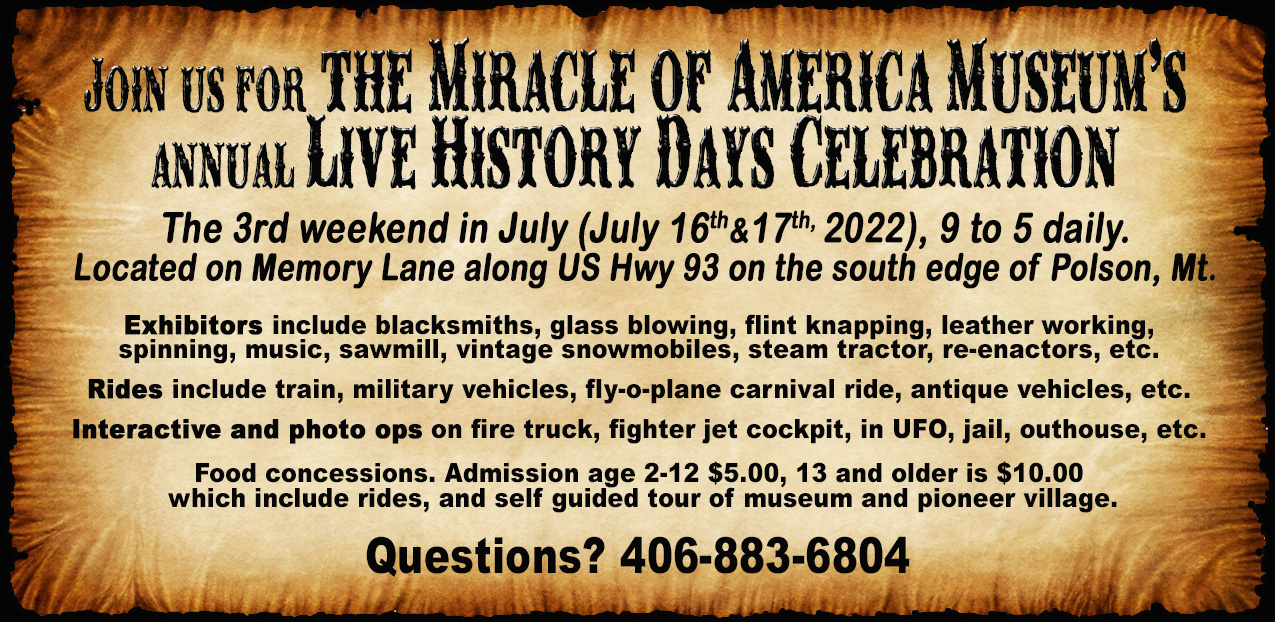 The Miracle of America Museum, Polson, Montana, located on Memory Lane has many nicknames, but “The Smithsonian of the West” is probably the most fitting. Tracing America’s history from the walking plow to walking on the moon is easy when you’ve got the largest and most diversified collection in Montana. Just the military exhibits alone go from Minuteman to Desert Sand and you might get a bit choked up with gratitude for our veterans viewing over 30 military vehicles and thousands of pieces of war memorabilia. When a teenage girl says that the Miracle of America Museum is the “Awsomest” she is not just talking about the numerous kid friendly, interactive things interspersed with the 42 buildings in the 4.5 acre village outside. Another student wrote in the comment book,”I wish they would teach this stuff in school”.