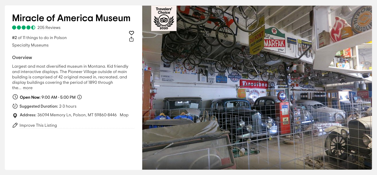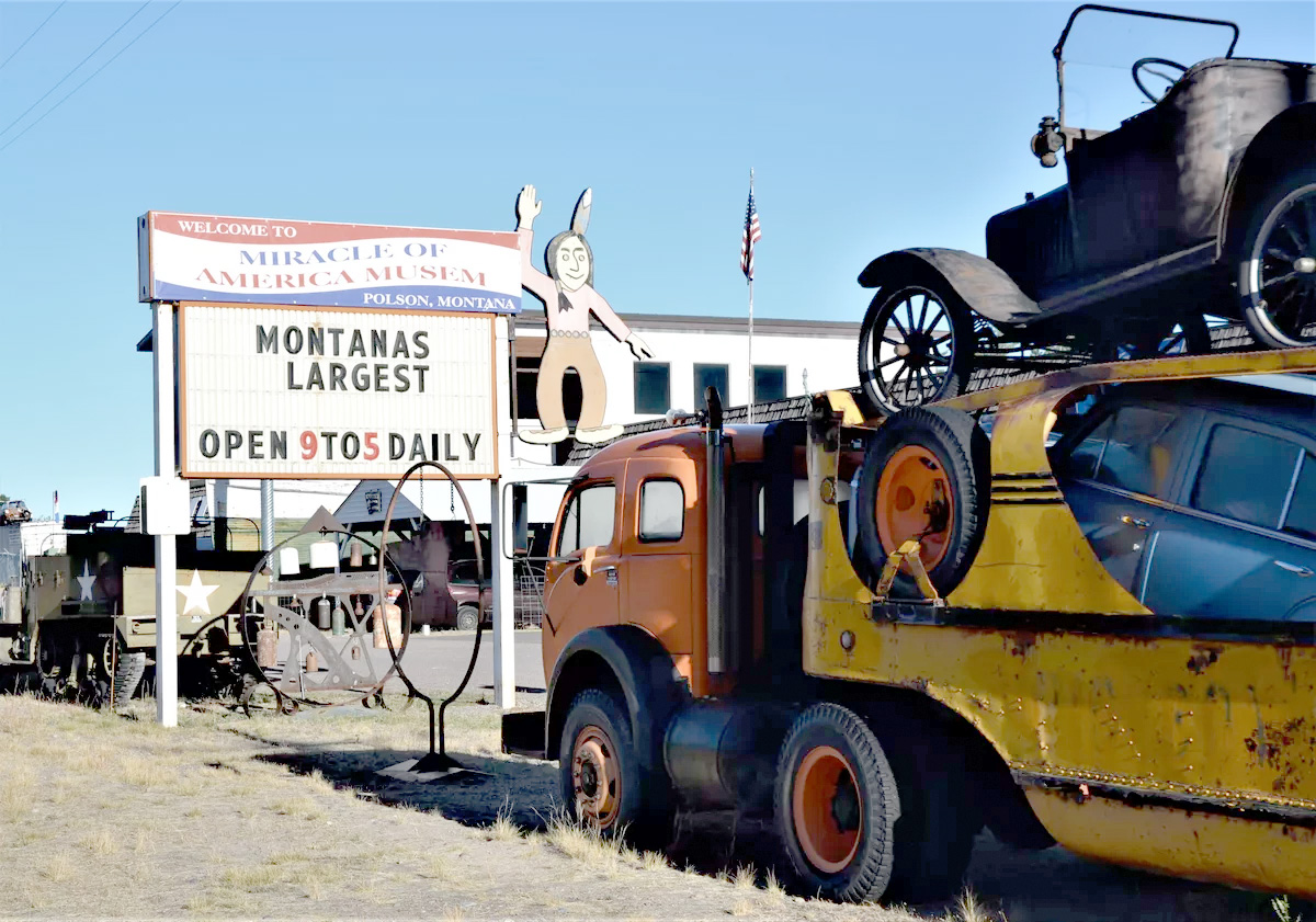 Evidence of these businesses in the form of souvenirs, photos, and various forms of memorabilia has been collected for almost 25 years and is displayed as part of the vast “Montana” collection at the Miracle of America Museum (MOAM), just south of Polson. Gil Mangels, founder of this non-profit museum, is happy to show you where these souvenirs, advertising items, and other memorabilia are displayed. Items may be as tiny as a spoon, or matchbook, and other trinkets, to vintage state highway maps. New building for 2019 includes a recreated WWII military bomber crew barracks and a recently built antique gunsmithing shop. Look for Snoopy and Charlie Brown on air patrol in full size bi-plane.